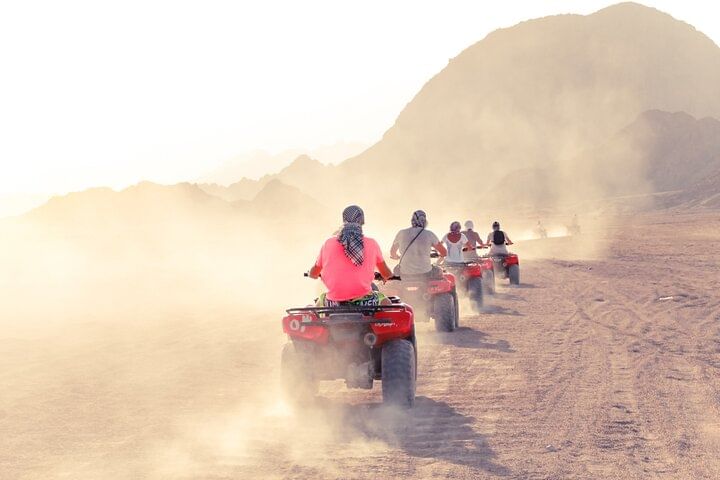 Experience a thrilling desert adventure with ATV Quad Super Safari with Sunset, Camel & Dinner - Marsa Alam. ride a quad bike, explore a Bedouin village, enjoy a camel ride, savor a barbecue dinner, and witness a traditional show.