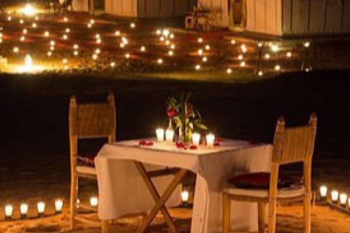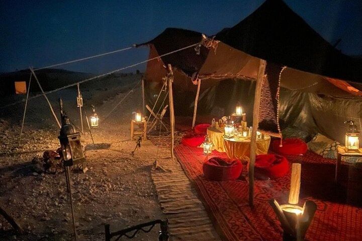 Romantic camel ride across the Agafay Desert Delicious dinner beneath the starlit sky Traditional Berber entertainment Stunning panoramic views of the Atlas Mountains An unforgettable desert experience