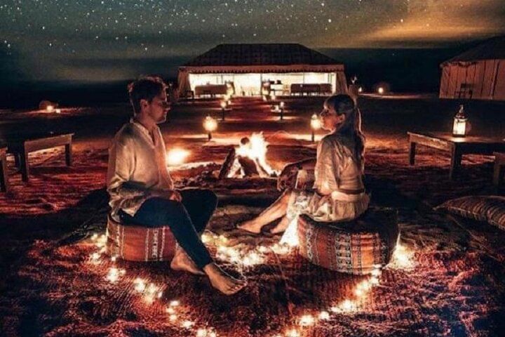 Enjoy an enchanting evening in the Agafay Desert with a romantic camel ride, followed by a delectable dinner and traditional Berber entertainment.