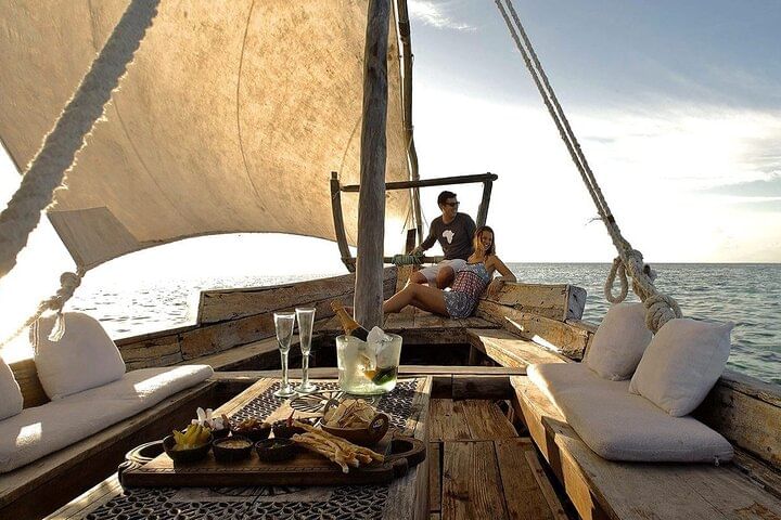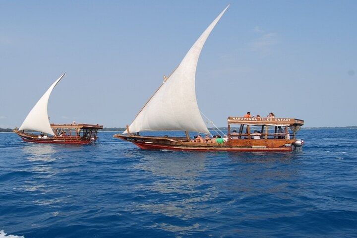 Immerse yourself in an unforgettable experience aboard a traditional Dhow, gliding through the pristine blue waters of Zanzibar. As you cruise along, enjoy the serene beauty of the ocean and the vibrant marine life visible beneath the clear waters from th